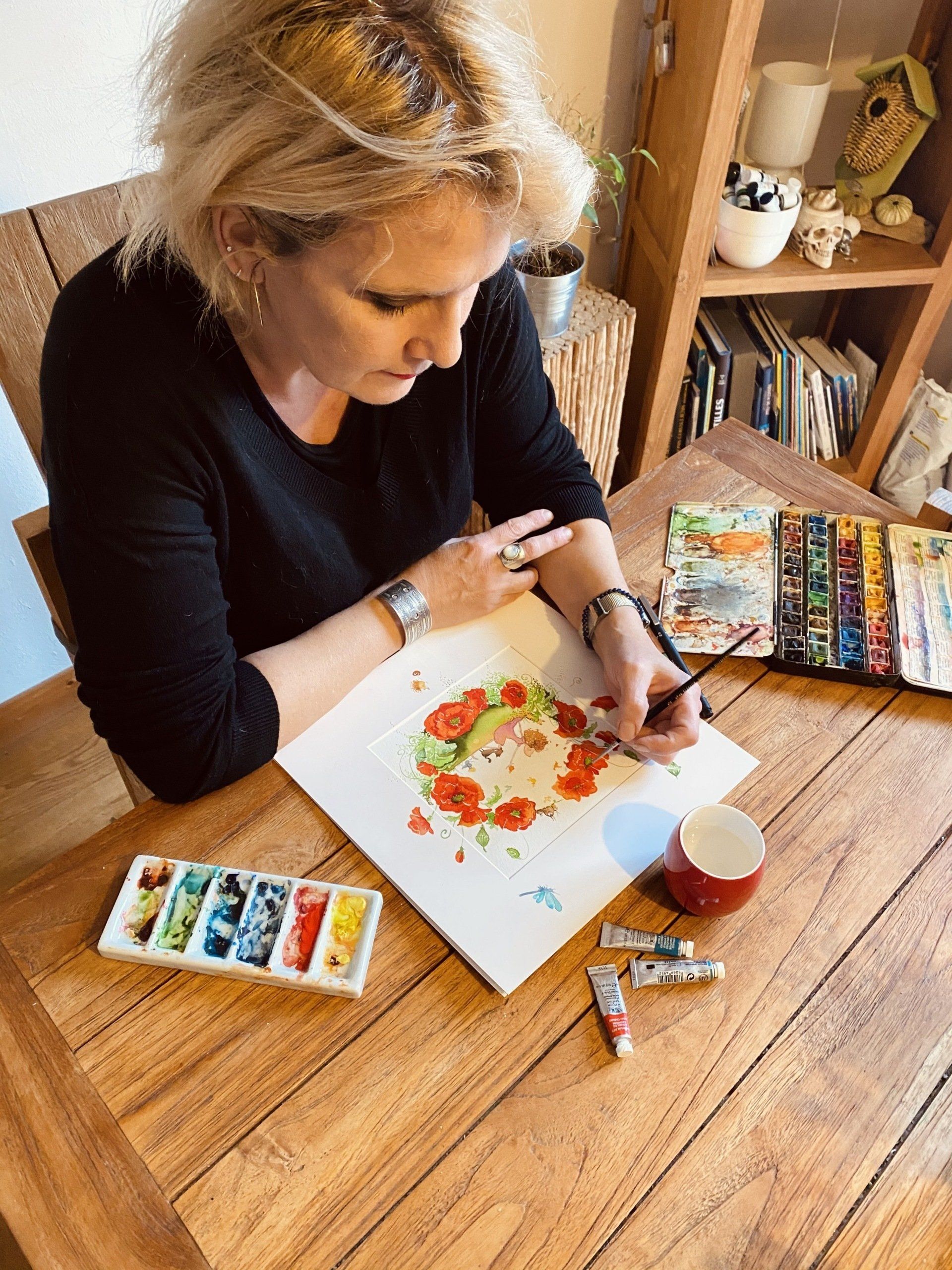 Lucie m’a envoyé un message sur Instagram il y a 2 ans, où je poste régulièrement mes aquarelles. On a tout de suite bien accroché et la collection s’est fait petit à petit. Quand je vois le succès des cartes aujourd’hui, je suis vraiment fière de faire partie de l’aventure.
